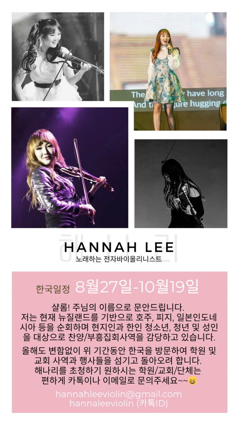 [보도자료] 뉴질랜드에서 사역중인 노래하는 전자바이올리니스트 해나리, 한국 사역위해 8월 말 내한