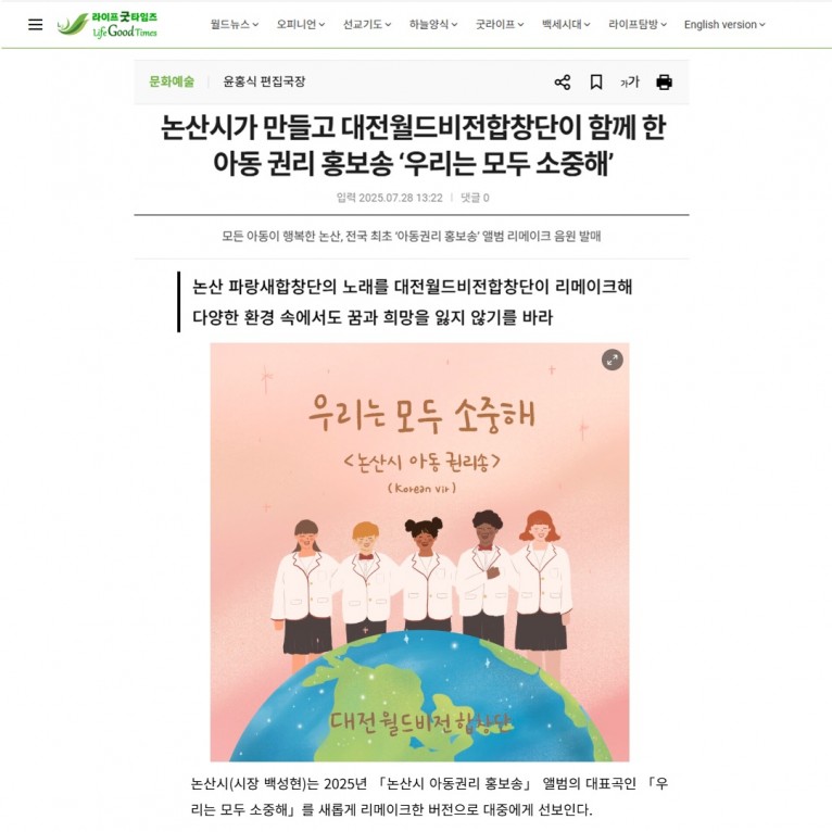 [기사] 논산시가 만들고 대전월드비전합창단이 함께 한 아동 권리 홍보송 ‘우리는 모두 소중해(라이프굿타임즈)