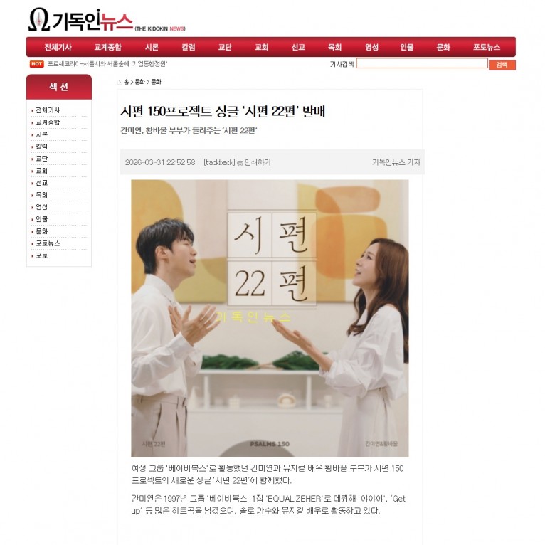 [기사] 시편 150프로젝트 싱글 ‘시편 22편’ 발매(기독인뉴스)