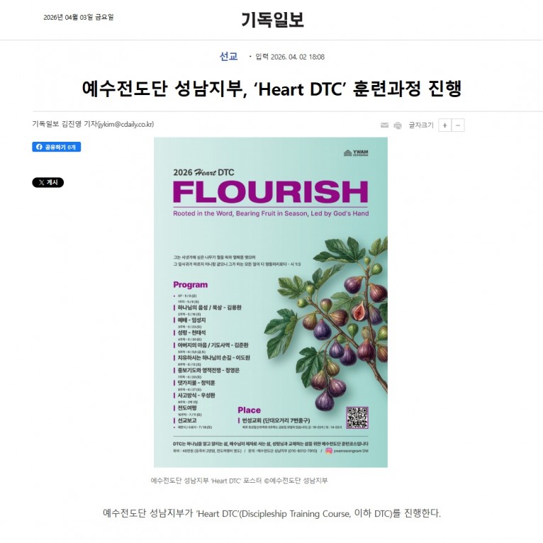 [기사] 예수전도단 성남지부, ‘Heart DTC’ 훈련과정 진행(기독일보)
