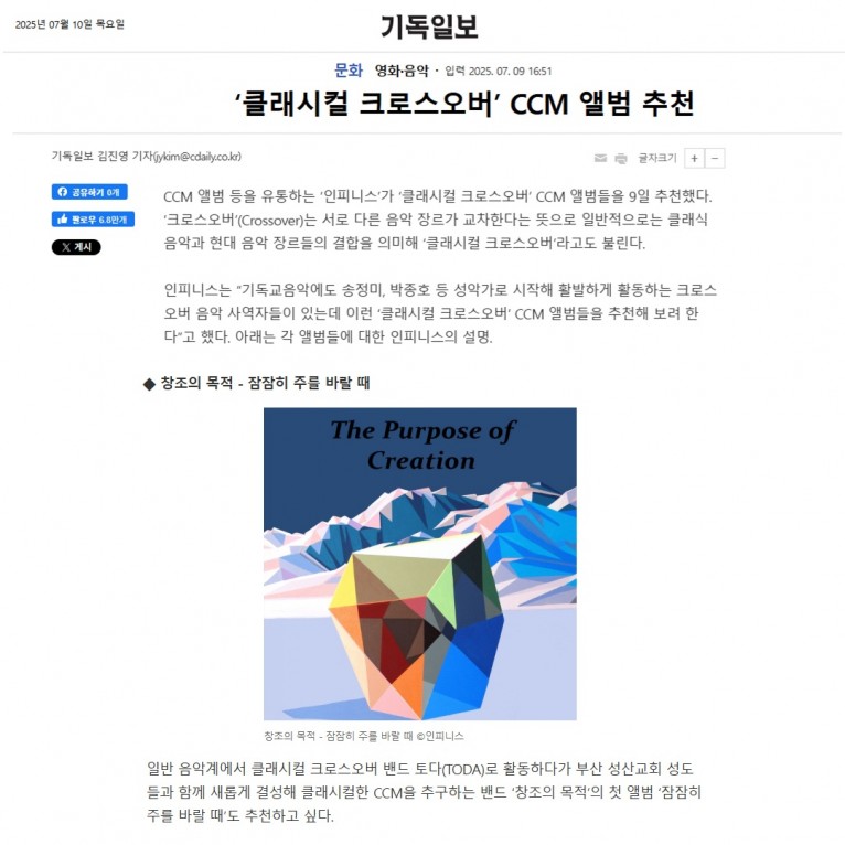 일반 음악계에서 클래시컬 크로스오버 밴드 토다(TODA)로 활동하다가 부산 성산교회 성도들과 함께 새롭게 결성해 클래시컬한 CCM을 추구하는 밴드 ‘창조의 목적’의 첫 앨범 ‘잠잠히 주를 바랄 때’도 추천하고 싶다.