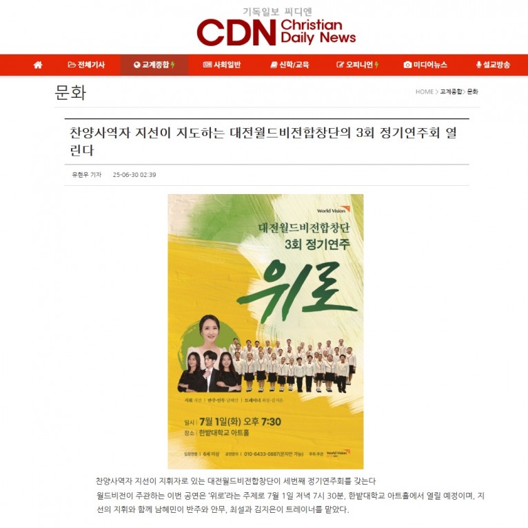 [기사] 찬양사역자 지선이 지도하는 대전월드비전합창단의 3회 정기연주회 열린다(기독일보 씨디엔)