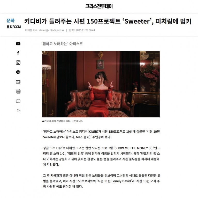 뮤직타임 [기사] 키디비가 들려주는 시편 150프로젝트 ‘Sweeter’, 피처링에 범키(크리스천투데이)